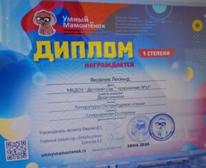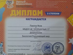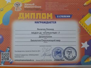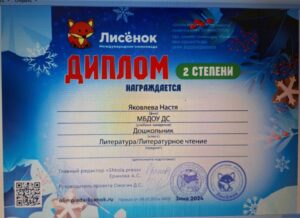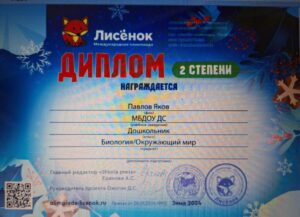 | 8 | Яковлев Владимир | 2021г | Международный конкурс «Умный мамонтенок» | Сертификат |