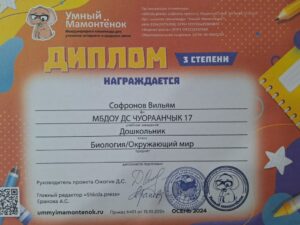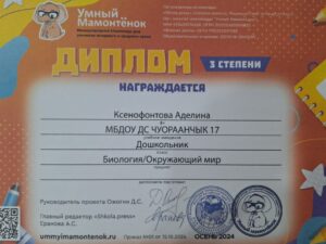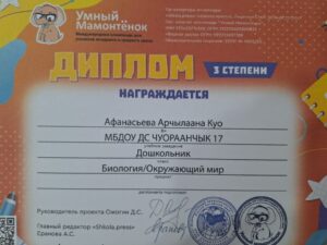 | 11 | Кононова Уйгулаана | 2021г | Международный конкурс «Умный мамонтенок» | Диплом 1 степени |