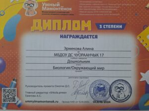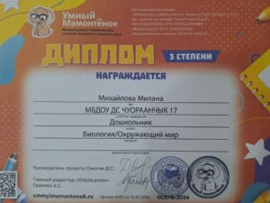 | 3 | Михайлова Таяна | 2021г | Международный конкурс «Умный мамонтенок» | Диплом 3 степени |
