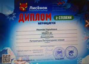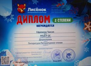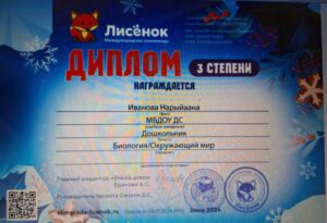 | 10 | Иванова Таяна | 2021г | Международный конкурс «Умный мамонтенок» | Диплом 2 степени |
