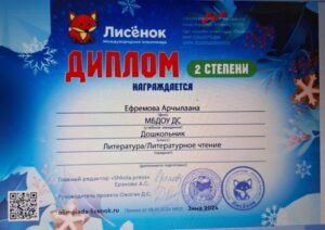| 14 | Лепчикова Диана | 2021г | Международный конкурс «Умный мамонтенок» | Диплом 2 степени |