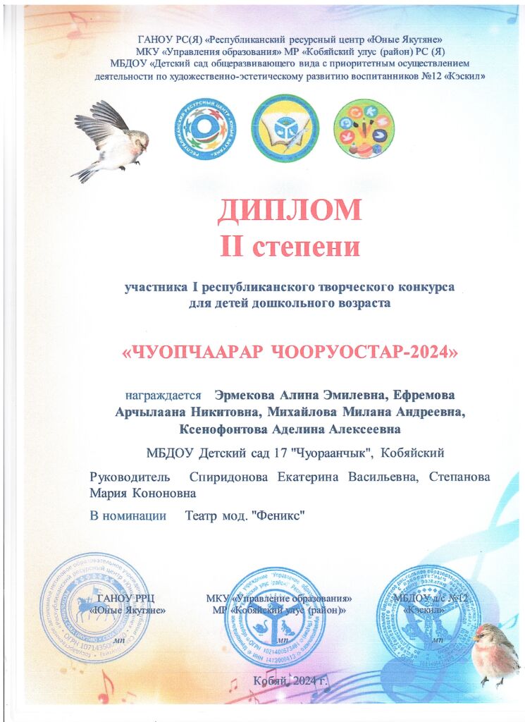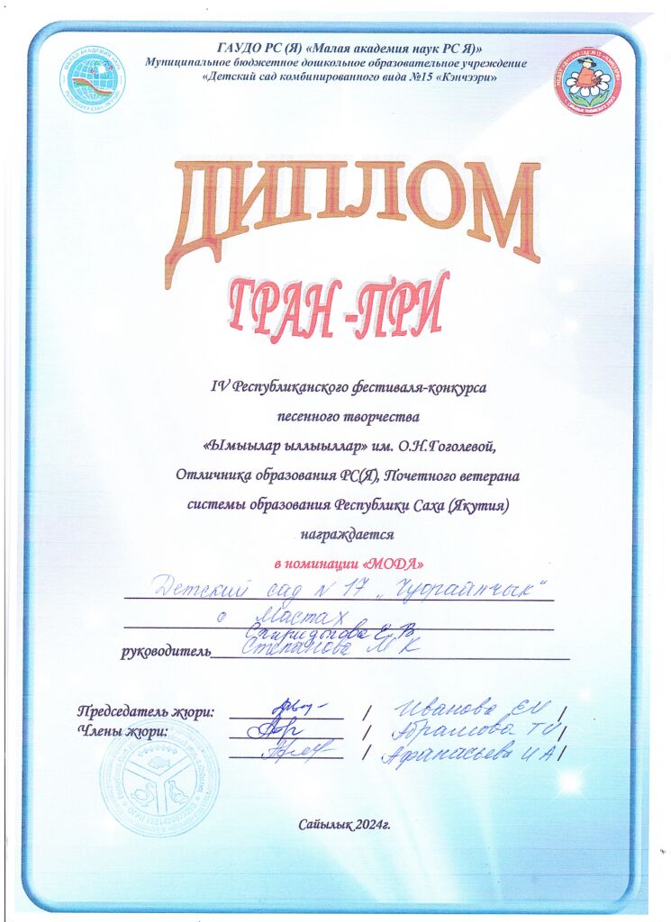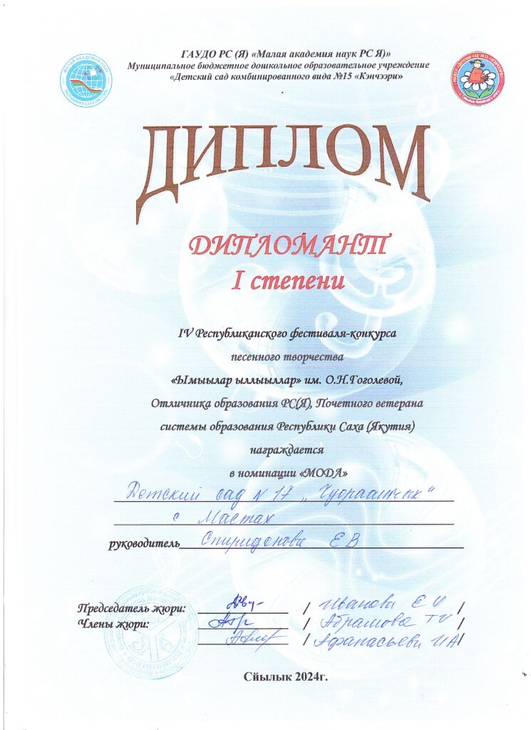 Воспитателя МБДОУ Д/C №17 «Чуораанчык» с. Мастах, Кобяйский улус, РС (Якутия)